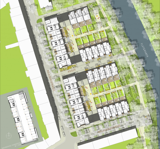 Zwei Baufelder bilden je ein U mit Garten zur Gera hin; sie sind über einen gemeinschaftlich nutzbaren Anger gekoppelt.