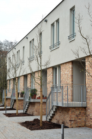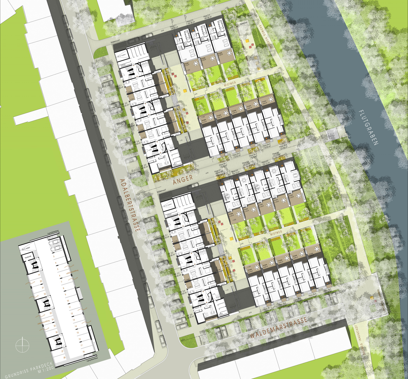 Die Schenkel bilden Reihenhauszeilen mit hofseitigem Garten. Sie verzahnen sich mit den Mehrfamilienhäusern und schaffen durch ihre Zweigeschossigkeit einen harmonischen Übergang zur Flussaue.
