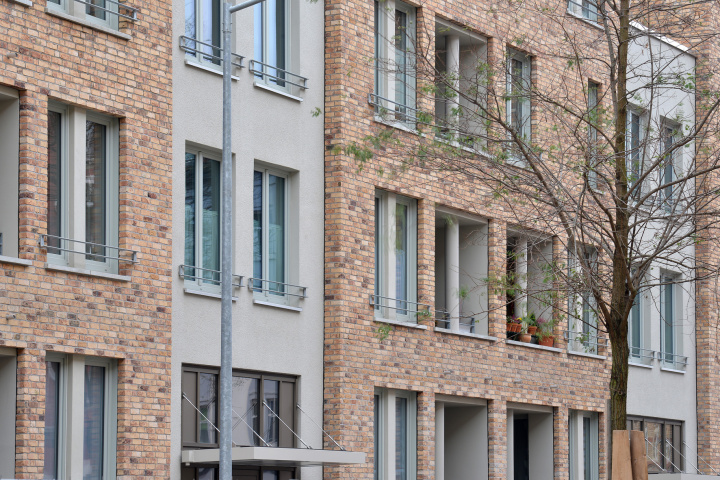 Entlang der Adalbertstraße stehen Mehrfamilienhäuser mit ost-west-orientierten Wohnungen. Sie bilden ein eigenständiges Pendant zur gegenüberliegenden Bebauung. Im Detail nehmen stehende Fensterformate, Fassadenrücksprünge, Klinker- und Putzfassaden und die bewegte Dachlandschaft Elemente der Gründerzeitarchitektur auf.