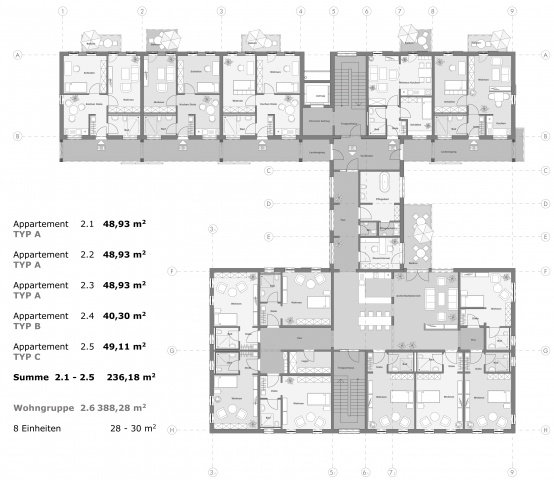 Im Ergebnis des Umbaus entstanden acht altersgerechten Wohnungen, zwei ambulant betreuten Wohngruppen für je acht Bewohner mit zugehöriger Funktionsstruktur sowie vier Mietwohnungen im 2. OG des Nordflügels. Eine Begegnungsstätte bzw. ein Vereinsraum runden das Angebot ab.