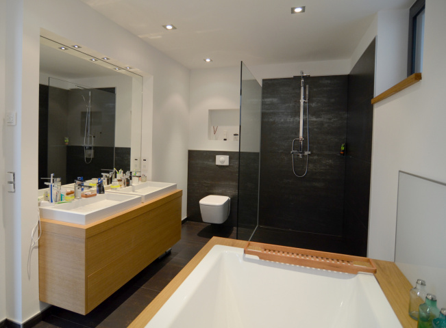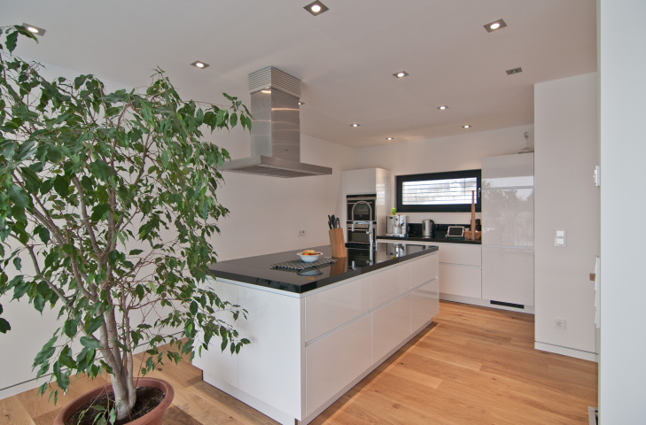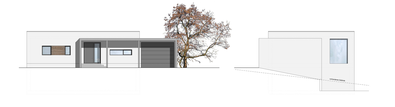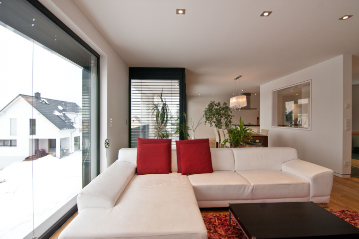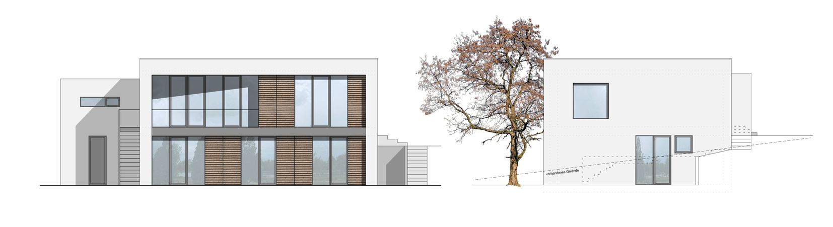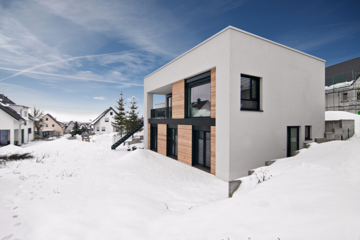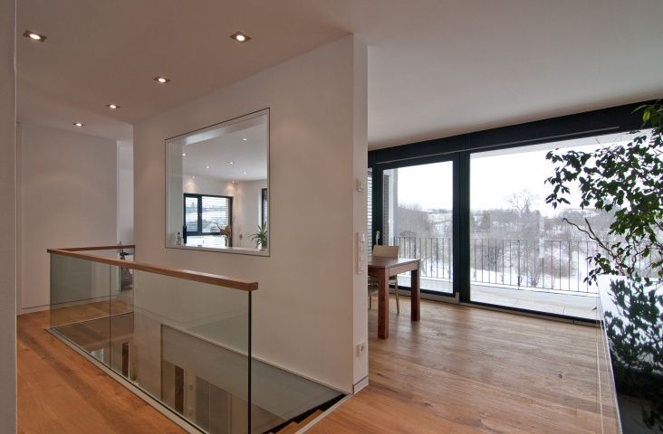 Moderne Architektur trotz strenger städtebaulicher Vorgaben. Nicht unmöglich wie das Einfamilienhaus in Marbach zeigt. Ein flaches Dach, eine klare kubische Bauform, auf Wunsch der Bauherren haben wir einen Weg gefunden neues Bauen in einem gewöhnlichen Baugebiet einzuführen. Für die genehmigungsfähige Umsetzung wurde eine völlig neue Dachkonstruktion entwickelt. Die exponierte Lage am Hang war eine weitere Herausforderung die das Gebäude prägen sollte. Nur vom eigenen Garten wirkt das Gebäude in voller Höhe, offen mit Ausblick auf die Stadt. Natürliche Holzelemente erzeugen ein harmonisches Farbspiel. Das offene Innenraumkonzept unterstreicht die Entwurfsidee einer modernen Wohnlandschaft mit vielen dezenten Besonderheiten. Eine Loggia mit weitem Blick erweitert den großzügig wirkenden Innenraum und schafft eine fließende Verbindung zwischen Innen und Außen.