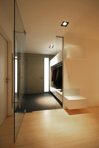 Wir wählten eine der beiden zulässigen Weißtöne für die Fassade und setzten das Sockelgeschoss mit hellen Klinkern ab. Über einen Tiefhof mit Freitreppe werden die Untergeschossräume belichtet. Das Untergeschoss ist variabel nutzbar und so vorgerüstet, dass aus der „Kinderetage“ entweder eine separate Wohneinheit oder eine Wellnesszone entstehen kann.