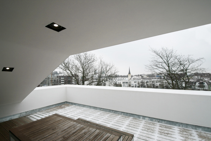 Die durchbindende Wohnebene und der Elterntrakt sind im Obergeschoss untergebracht. Von der offenen Wohnküche öffnet sich der Blick über die Stadt. Raumhohe Faltelemente lassen sich vollflächig öffnen, der Essbereich wird dann zur Loggia. Den begehrten Domblick eröffnet die geräumige Dachterrasse, die eine Hälfte des Daches einnimmt. Das Haus erfüllt hohe Ansprüche an Energieeffizienz: es verfügt über eine Solar- und Photovoltaikanlage, eine Eisspeicherheizung und eine Regenwasserzisterne.