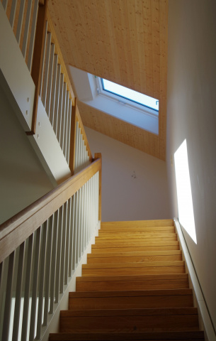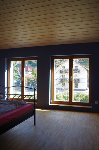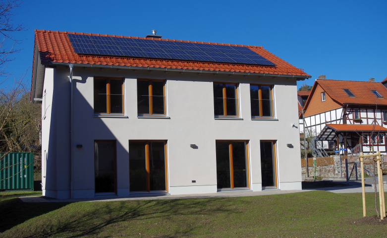 Im Dorfkern von Rüdigsdorf ist auf einem ehemals ruinösen Grundstück ein modernes Wohnhaus für eine junge Familie entstanden. Der Baukörper orientiert sich in Kubatur und Dachform an den historischen Nachbargebäuden. Mit Holz und Ziegel wurden vorrangig heimische Baustoffe verwendet, welche ein gesundes Raumklima hervorrufen. Der Bauherr wünschte sich ein Effizienzhaus- Standard 55 und die Unabhängigkeit von fossilen Energieträgern. Die Photovoltaikanlage auf der Südseite des Daches versorgt die Wärmepumpe mit Speicher und künftig die Wallbox für das E- Auto. Aus den großzügigen Glaselementen des Wohnbereichs führt der Blick in den Garten, welcher mit Blühtenhecke und Apfelbäumen das Haus in die Umgebung einfügt.