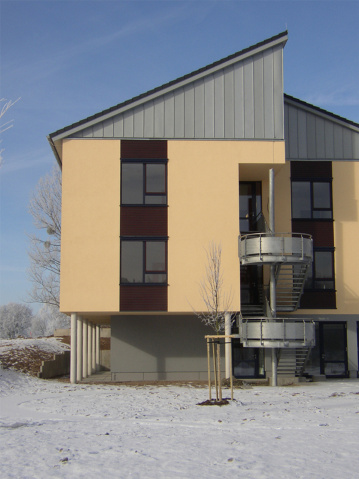 Mit seiner Gliederung in drei ablesbare Baukörper, seinen wohnhausähnlichen Proportionen, seinen Konstruktionen und Materialen fügt sich das Haus gut in das Ortsbild ein.