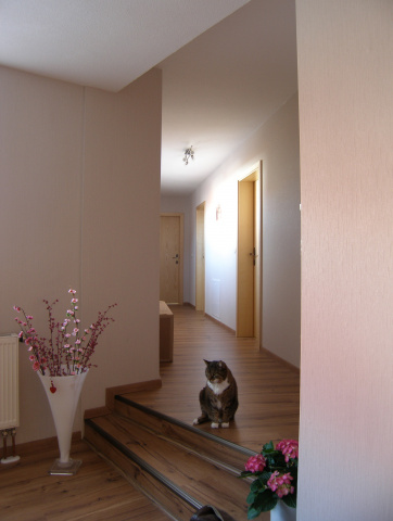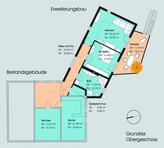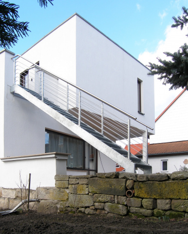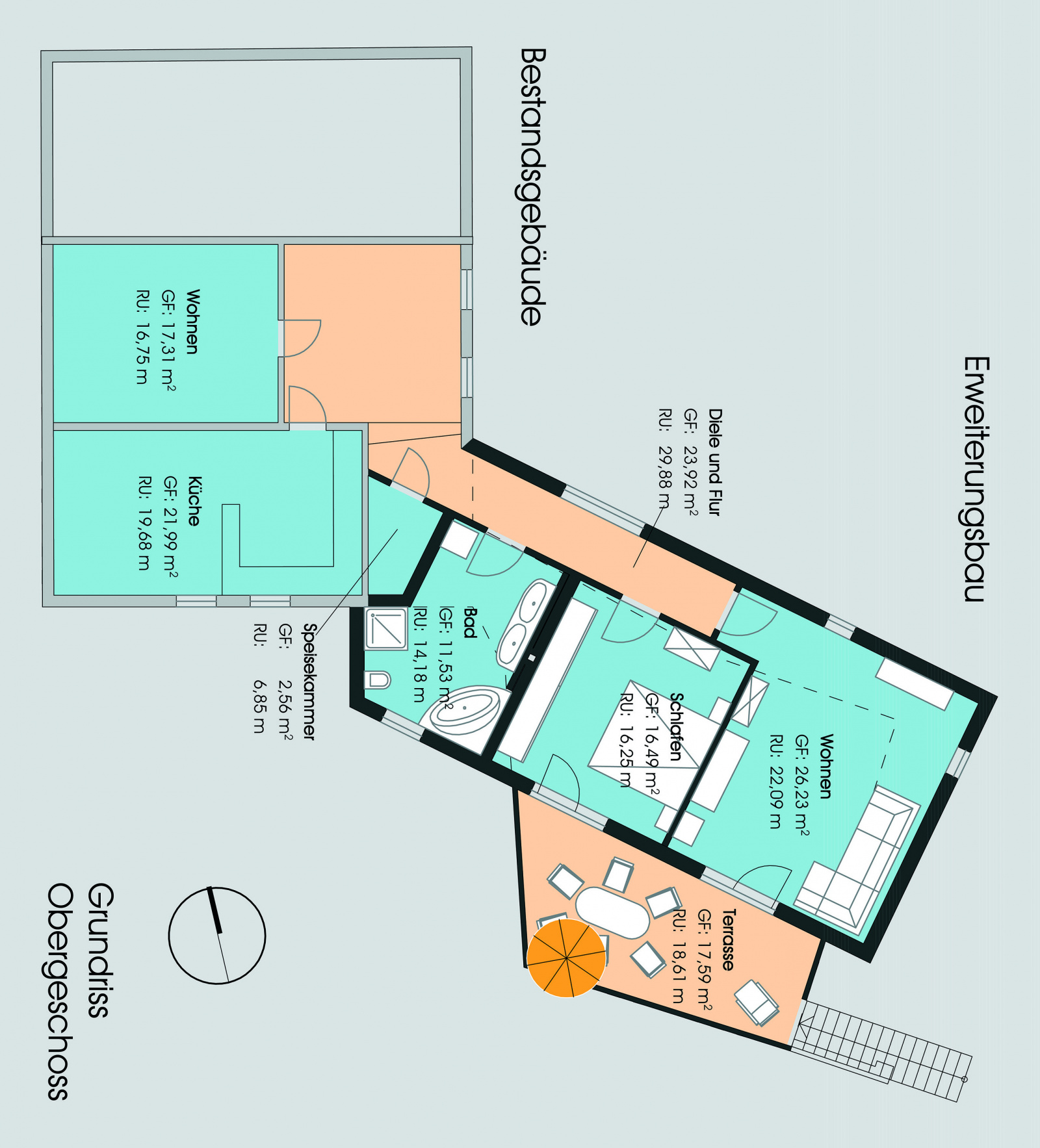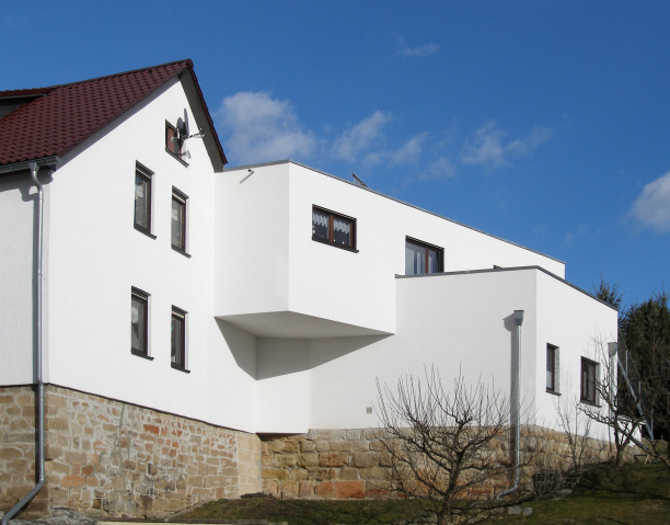 Das Grundstück befindet sich im Ortszentrum, nicht weit von der Kirche entfernt. Das Wohngebäude besteht aus einem Haupthaus und einem erdgeschossigen Anbau. Im Erdgeschoss wohnen die Senioren und im Dachgeschoss die junge Familie. Das Dachgeschoss sollte erweitert werden. Dafür wurde das Dach des Anbaus abgebrochen und ein Erweiterungsbaukörper darauf gesetzt. Der bestehende Anbau besitzt eine sehr unregelmäßige Grundrissform, auf die in der Planung reagiert wurde. Der neue Baukörper wurde in Form einer Box so auf dem Anbau abgesetzt, dass dreiseitig ein Überstand und auf einer Seite eine Terrasse entstand. Diese Terrasse ist vom Wohnbereich zugänglich und besitzt eine Treppe, die in den rückwärtigen Gartenbereich führt. Die neu geschaffenen Wohnräume werden direkt über die Diele im Obergeschoss von der bestehenden Wohnfläche erreicht. Um alle konstruktiven und statischen Aufgaben lösen zu können, wurde die Box in Holzrahmenbauweise mit einer oberen und unteren Holzbalkendecke errichtet.