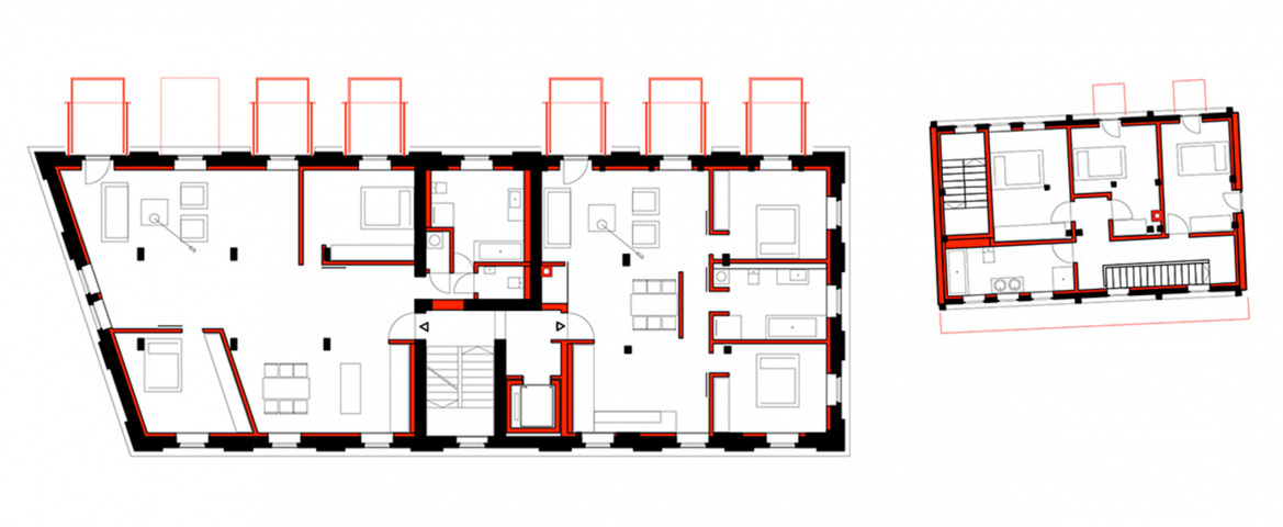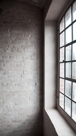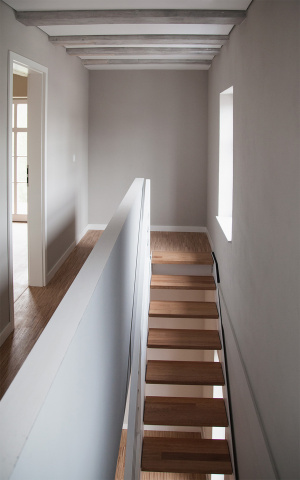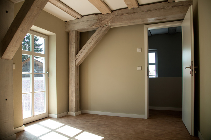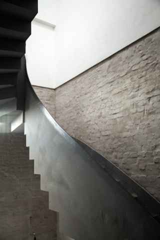 Im Inneren setzt sich diese angemessene Kenntlichmachung von Bestand und Eingriff liebevoll fort: alte Mauerwerksteile werden geschlämmt und zeigen sich in einer charakteristischen Rauigkeit, neue Öffnungen und Bauteile sind dagegen glatt verputzt. Die bestehende Stahl-Stein-Treppe wird saniert und mit Klar-Lack-Beschichtung konserviert. Das Tragwerk des innen liegenden, hölzernen Skelettbaus wird sichtbar belassen. Alte Rundbogen-Klinkerstürze werden Stein für Stein wiederhergestellt, neue angelegte Fensteröffnungen mit geraden, sichtbar in der Fassade liegenden Stahlbeton-Stürzen überspannt, die vor Ort mit der Hand gegossen wurden.