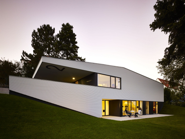 Ansicht Südwest/Dämmerung, Bild: Victor S. Brigola Das an einem steilen Südhang gelegene Grundstück misst gut 1.000 qm. Es befindet sich in zweiter Reihe einer Wohnsiedlung der 1920-er Jahre. Das neue Haus präsentiert sich von oben bewusst eingeschossig und nimmt sich zurück. Das Wohnhaus stellt sich als Längsriegel dar, der das Gelände so terrassiert, dass sich die im Untergeschoss befindliche Wohnebene nach Süden zum Garten hin öffnet, während Kinder-, Gäste- und Arbeitsräume im Erdgeschoss eher Ost-West orientiert sind. Die Terrassierung ermöglicht …