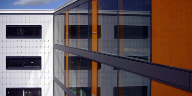 Innenhoffassade, Bild: Claus Bach Mit dem Neubau wird ein vorhandener Schulstandort komplettiert. Der kompakte, übersichtliche Baukörper ordnet zum einen das heterogene städtebauliche Umfeld, zum anderen ist die Schule für Kinder und Lehrer ein Ort, der ganztägig die Möglichkeiten eines „offenen Hauses“ bietet. Der Idee der Ganztagsschule entsprechen überschaubare Raumgruppen in unterschiedlichen Gebäudeteilen. Die Schule wickelt sich um einen Innenhof. Zentrale Schaltstelle ist der Glaskörper der Aula. Das Nachmittagshaus als …