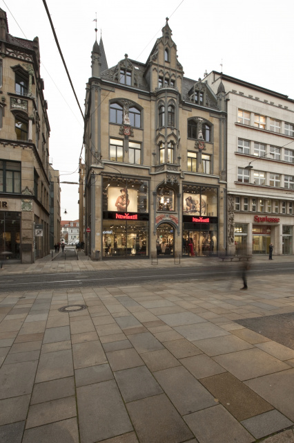 Gebäudeansicht Anger, Bild: Jürgen Ballasus Das Büro- und Geschäftshaus „Anger 24“ wurde 1900 als „Haus zur Goldenen Krone“ von den Gebrüdern Lamm errichtet. Ursprünglich wurde es als Textilgeschäft mit Textilfertigung genutzt. 1998 wurde das Gebäude an einen Investor verkauft und komplett saniert. Das heutige Geschäft sollte 2016 um weitere Verkaufsflächen vergrößert werden. Das erste Obergeschoss wurde der Ladennutzung zugefügt und der eingeschossige Wintergarten durch einen großzügigen Glasanbau ersetzt. Dieser beherbergt die Erschließung zum Unter- und Obergeschoss. Durch den Verzicht auf Decken im Glasanbau entstand ein imposanter Raum, welcher Sichtbeziehungen in alle Verkaufsebenen zulässt und großzügig wirkt. Die neue Glasfassade bezieht die Keilhauergasse durch große ungeteilte Glasflächen in den Verkaufsraum mit ein.
