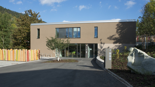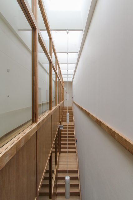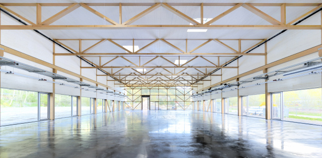 Innenansicht, Bild: www.peters-fotodesign.com Der Baukörper ist längs zum Tal und der Bahnlinie orientiert, der eingeschossige Büroteil zur Ortschaft hin. Nach Osten schließt die Halle an. Das Erdgeschoss ist vollständig verglast, darauf lagert ein mit Schiefer bekleidetes Volumen. Durchgängig transparent ist auch die Verbindung zwischen Büro und Werkhalle und wird zum Sinnbild für demokratische Arbeitsstrukturen. Die ortstypische Schieferbekleidung der Halle interpretiert die Verwendung des traditionellen Materials in moderner Weise. Ein lockerer Birkenhain verwebt den Neubau mit der grünen Umgebung. Es wurde ein Plusenergiehaus in Holzbauweise konzipiert, das ohne fossile Energie auskommt. Erdkollektoren, Photovoltaikanlagen und Batteriespeicher decken den kompletten Bedarf von Gebäude und Produktion bei gleichzeitig hohem Autarkiegrad.