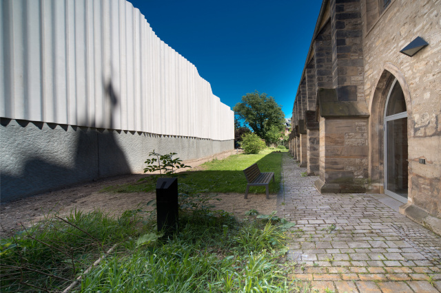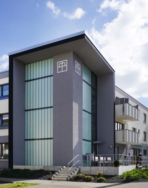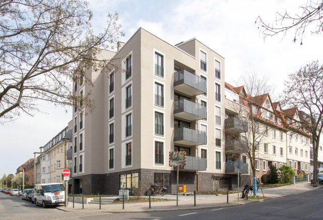 Hofansicht, Bild: Alexander Korb In unmittelbarer Nähe zum Flutgraben der Erfurter Gera und dem zentral gelegenen Anger entstand ein Mehrfamilienhaus mit insgesamt zwölf Wohneinheiten. Bei der Gestaltung der Immobilie wurde auf die Verwendung von hochwertigen Materialien und neuster Technik Wert gelegt. Ein begrünter Innenhof sowie Balkone und Terrassen bieten den Bewohnern ausreichend Rückzugsmöglichkeiten, um der Hektik des Alltags auch im Stadtkern entfliehen zu können.