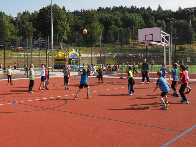 Schulsportplatz "Alte Straße" in Zella-Mehlis, Bild: Andrea Ziegenrücker Die ehemalige Schulsportanlage „Alte Straße“ wurde auf altem Standort neu gestaltet. Sie wird von Schulen sowie Vereinen genutzt und ist für Jugendwettkämpfe geeignet. Das Kunstrasenspielfeld hat eine Nettofläche von 90 x 45 Metern. Weiterhin gibt es zwei 75 Meter lange Sprintlaufbahnen mit für Breitensport tauglichem Kunststoffbelag, eine Weitsprunganlage, zwei Kugelstoßkreise sowie ein Kleinspielfeld von 48 x 28 Metern, ebenfalls mit Kunststoffbelag, auf dem unter anderem Feldhandball, Basketball, Tennis und Volleyball möglich sind. Flutlichtanlage, Zuschauertribüne, Ballfangzäune und Einfriedung ergänzen das Ensemble. Die Spielfelder wurden mit gepflasterten Wegen umgeben. Die Tribüne wurde in den natürlichen Hangbereich integriert. Seit der Einweihung wird mit großer Freude gelaufen, gekickt und gesprungen.