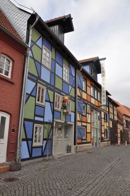 Straßenansicht, Bild: Sabine Schwerin Die 2011 eröffnete Kindererlebniswelt „Rumpelburg“ erfreute sich von Anfang an eines hohen Zuspruchs. Durch die Angliederung des benachbarten Gebäudes erfolgte eine Raumerweiterung auf allen Geschossebenen mit vielen neuen Möglichkeiten der Erlebbarkeit. Der Empfangs- und ein großzügiger Garderobenbereich entstanden im Erdgeschoss. Besondere Highlights bilden das Baumhaus und ein begehbares Spielhaus für die ganz kleinen Besucher. Mit der Nutzungsänderung des ehemaligen städtischen Kostümverleihs ging eine komplette Gebäudesanierung einschließlich statisch-konstruktiver Eingriffe in die Holztragkonstruktion einher. Das besondere Konzept des Spielraumausbaus, die thematischen Illusionsmalereien sowie das Prinzip der Fassadengestaltung finden sich bei der Gebäudeerweiterung wieder.