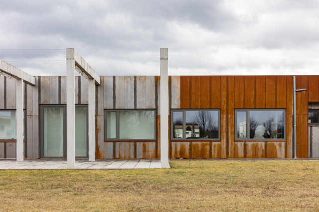 Fassade Wohnteil, Bild: Tectum Hille · Kobelt Architekten, © Alexander Burzik Die Jahreszahl auf einem Betonträger der ehemaligen Straßenmeisterei weist auf das Baujahr 1968 hin. Der Gebäudekomplex besteht aus einer circa 90 Meter langen Halle und dem quer dazu liegenden ehemaligen Sozialtrakt. Dieser wurde zum Wohnhaus mit Einliegerwohnung umgebaut. Dabei wurde innen eine 25 Zentimeter starke Porotonschale vor die bestehenden Wände gesetzt. Die Fassade wurde mit Cortenstahl verkleidet. Fußböden wurden mit geräucherter Eiche, Fliesen oder Estrich belegt. Die Wärmeversorgung erfolgt über eine Wärmepumpe mit Flächenkollektoren, welche im Außenbereich oberflächennah verlegt wurden. Die angegliederte Galerie „SILO“ umfasst circa 200 Quadratmeter Ausstellungsfläche und spiegelt die technische Vergangenheit des Gebäudes wider.