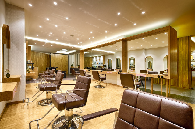 Schnittplätze, Bild: Marcel Krummrich Eine Filiale des seit über zwanzig Jahren erfolgreichen Unternehmens „Rundhairum“ wurde erweitert sowie zeitgemäß und nachhaltig umgebaut. Im Erdgeschoss eines kleinen Altstadthauses an der Barfüßerkirche gelegen, steckt sich der Grundriss bis zum Innenhof durch und dreht sich mit der historischen Struktur des Hauses gegenüber der Eingangsfassade. Die Verdrehung wird im Inneren auf alle Ausbauelemente (Möbel, Lichtvouten, Decken, Fußboden usw.) übertragen und verbindet sich zu einer dynamischen Gestaltungslinie. Diese gliedert den Grundriss in eine Empfangs- und Wartezone mit angeschlossenem Retail sowie den Bereich der Schnitt- und Waschplätze. Holzoberflächen bei Möbel, Fußboden und Lammellenwänden in Verbindung mit Vintage-Fliesen und Mustertapeten schaffen eine nachhaltige und warme Grundstimmung für die Gäste des Salons.