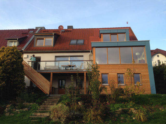 Südseite, Bild: Cornelia Sell Auf dem 11.000 Quadratmeter großem Grundstück mit Teich wünschten sich die Bauherren ein dem Standort angepasstes modernes Wohnhaus, das sich nach Süden orientiert und sich in die Hangsituation harmonisch einfügt. Darüber hinaus sollte die Blickachse zum Schloss Bertholdsburg berücksichtigt werden. Entstanden ist ein zur Straße hin zwei- und zum Garten hin dreigeschossiges Gebäude mit einer großzügigen Verglasung zur südlich liegenden Gartenseite. Aus den dahinterliegenden Wohnräumen ist ein freier Blick über das weitläufige Grundstück in die freie Landschaft sowie zum Schloss möglich. Vom großzügigen Balkon im Erdgeschoss führt eine Außentreppe direkt in den Garten bzw. zum Teich. Mitwirkung Leistungsphase 6: Bau- und Sachverständigenbüro Wolf, Gutendorf; Leistungsphase 8: Wogeplan GmbH, Zella-Mehlis.