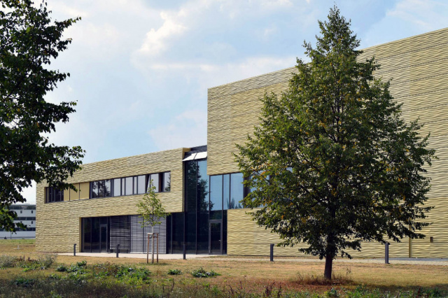 Kommunikations- und Informationszentrum der Universität Erfurt, Bild: Architektenkammer Thüringen Beurteilung der Jury zum Thüringer Staatspreis für Architektur und Städtebau 2018: Der Campus der Universität Erfurt wurde um einen klaren und modernen Baustein erweitert. Der Neubau des Kommunikations- und Informationszentrums (KIZ) positioniert sich selbstbewusst als Campusauftakt an der Max-Weber-Allee. Die Höhenabstufung des Neubaus überzeugt städtebaulich und nimmt Bezug zu den zwei anderen zentralen Campusbausteinen Bibliothek und Mensa. Auffallend ist die gold-gelb-metallisch schimmernde, …