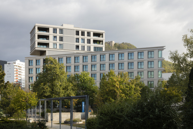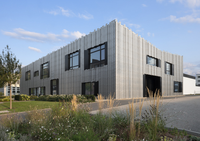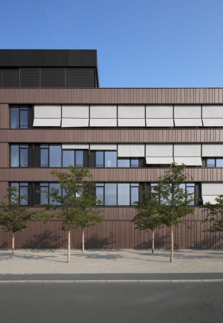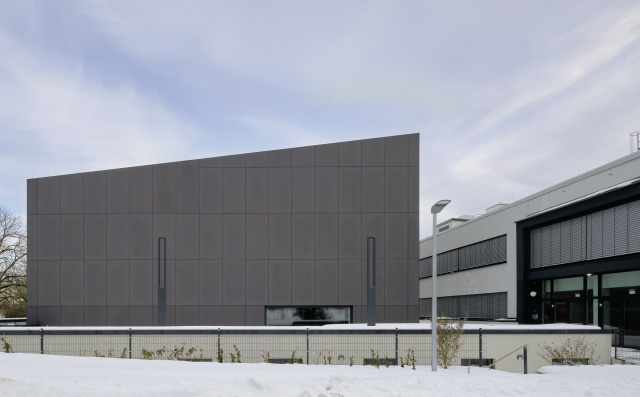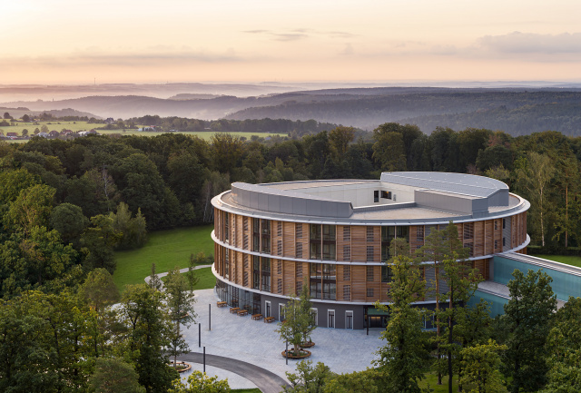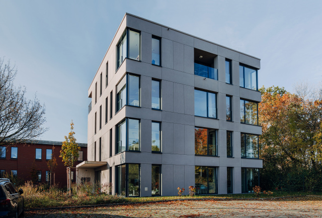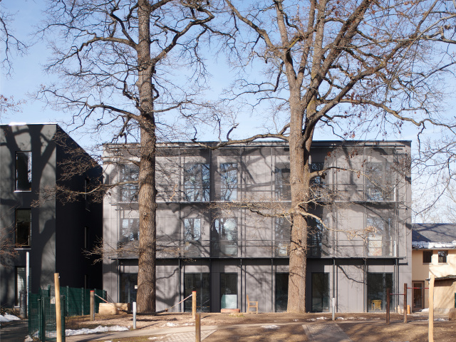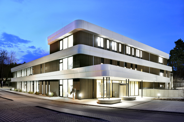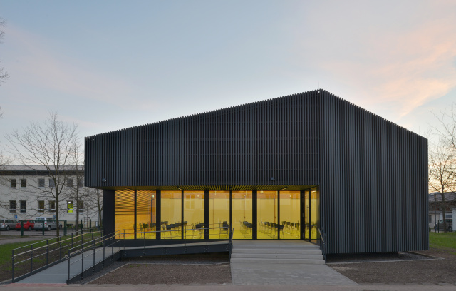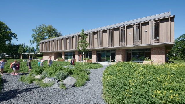 Eingangsbereich, Bild: Steffen Michael Groß Städtebaulich gliedert sich das Gebäude als eigenständiger, dreigeschossiger Baukörper in die umgebende Bebauung ein und nimmt in Form und Anordnung der rausgezogenen Geschossdecken und Brüstungen Bezug auf die Topographie des Baugebietes. Gestalterisch wurde in Form der Fassadengestaltung und Materialität auf den umgebenden Wald eingegangen. Mittels des trapezförmigen Grundrisses, der bandartigen Brüstung und Dachscheiben erhält der Baukörper eine gewisse Leichtigkeit. Durch die Lage des Baufeldes sowie der Nutzungsart sind keine entscheidenden emissionstechnischen Beeinträchtigungen für das Ökosystem zu erwarten. Ersatzpflanzungen wurden vorgenommen. Die Tragstruktur besteht aus einer Stahlbetonbauweise, das zweite Obergeschoss und die Fassade sind mit vorgefertigten Holzrahmenbauelementen ausgebildet.