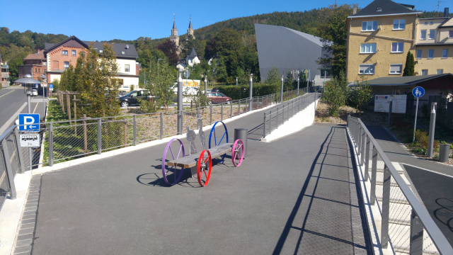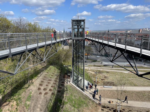 Blick vom Plateau, Bild: Claas Schulitz An der obersten Kehre zur landschaftsplanerischen Rampenanlage wurde die Aufzugsanlage samt überdachter Wartezone in die angrenzende Topographie aus Baumbestand und Erdwall integriert und stellt in Anlehnung an die Außenanlagenplanung ihren Bezug zum Festungsplateau durch zwei in V-Form angeordnete Brücken her. Die Fahrt mit dem Aufzug wird zum szenografischen Erlebnis: Zunächst taucht die Kabine langsam aus dem Erdwall auf und bewegt sich bald zwischen einer filigranen Stahlkonstruktion circa 14 Meter nach oben, um dann dem Besucher einen beeindruckenden Blick auf den Domplatz zu bieten. Über die beiden filigranen Brücken mit einer Spannweite von je 26 Meter, die einen „Einbahnverkehr“ für An- und Abreisende ermöglichen, erreicht der Besucher barrierefrei den Petersberg.