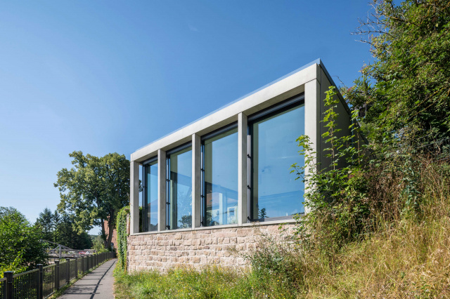Straßenansicht, Bild: Christian Brüstel Über der Stadt Jena zeigt sich der Objektstandort mit einer atemberaubenden Sicht hinab auf die Stadt. Der längs zur Straße errichtete Holzrahmenbau mit massivem Sockelgeschoss bildet eine natürliche Barriere zwischen Öffentlichem und Privatem. Der Hauszugang liegt im Untergeschoss. In der zur Straße orientierten Erschließung inszeniert sich beim Durchschreiten im Erd- und Obergeschoss der freie Panoramablick vom Saaletal bis zum Fuchsturm. Im westlichen Giebel befindet sich vor einer Galerie ein zweigeschossiges Fenster. Der Wohnraum im Erdgeschoss öffnet sich ebenerdig nach Süden zur großzügigen Gartenfläche und in die Landschaft. Die darüberliegende Schlafebene bietet den Blick auf einen bewaldeten Berghang und vermittelt ein Gefühl der Ruhe.