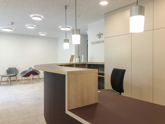 Rezeption im Foyer, Bild: Lars Jugel Das Gästehaus Dreibrunnen der Lebenshilfe Erfurt bietet, am Luisenpark gelegen, Bildungs- und Weiterbildungsmaßnahmen sowie Übernachtungsmöglichkeiten an. Mit der Modernisierung des Gästehauses wurden die Qualität und der Komfort der angebotenen Übernachtungen deutlich verbessert – durch eine neue räumliche Anordnung der Eingangssituation sowie der Gästezimmer und der Rettungswege im Ober- und Dachgeschoss. Im Erdgeschoss wurde die Eingangssituation offener und großzügiger gestaltet, mittels einer klaren räumlichen Verbindung des Foyers zu den beiden Speiseräumen und einer räumlichen Neuordnung der Speiseräume zueinander. Die Bäder der Gästezimmer im Ober- und Dachgeschoss wurden modernisiert und barriereärmer gestaltet. Für alle Zimmer wurde eine zeitgemäße, modulare und flexible Möblierung entwickelt.