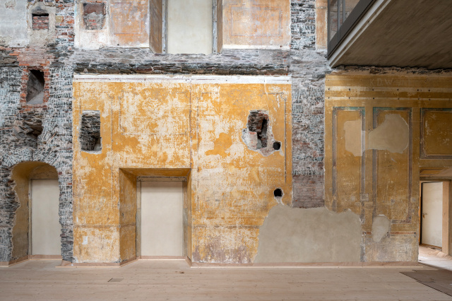 Emporensaal, Bild: Thomas Müller Dynastie – Dystopie – Denkort: Mit schweren Schäden haben die Nationalsozialisten nach einem geplanten Umbau zum Reichsgästehaus das Schloss Schwarzburg als Ruine hinterlassen. Seit 2019 erfolgte im Rahmen der Internationalen Bauausstellung (IBA) Thüringen ein Teilausbau des Schloss-Hauptgebäudes, um es nach Jahrzehnten erstmals wieder nutzbar und zugänglich zu machen. Unter dem Titel „Denkort der Demokratie“ wird die Nutzung als kultureller Knotenpunkt angestrebt. Bei der Sanierung sollten die Spuren der facettenreichen und mit vielen Brüchen versehenen Geschichte von Schloss Schwarzburg deutlich sichtbar bleiben. Gefördert wurde das Projekt durch das Bundesprogramm „Nationale Projekte des Städtebaus“. Um Interessierten Einblicke in die Bauarbeiten zu ermöglichen, entstand ein begleitender Audiowalk.