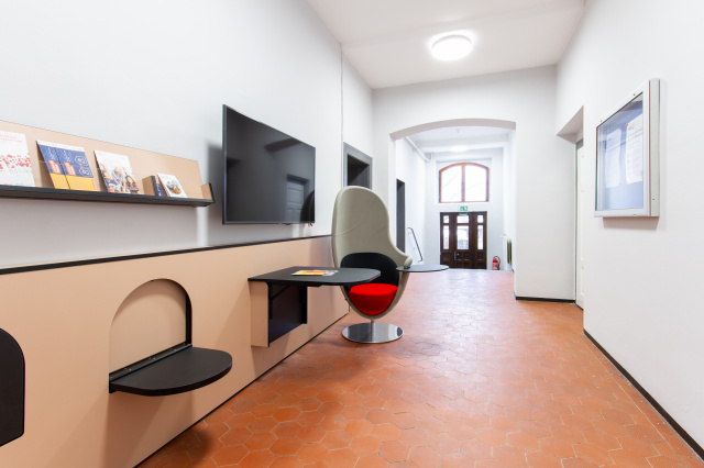 Flur, Bild: Sören Lindner, Freier Grafik- und Fotodesigner Das Projekt zielt auf notwendige mögliche Anpassungen baulicher Gegebenheiten im Bestand für eine inklusive Erwachsenenbildung in Thüringen, in der Umsetzung des Thüringer Gesetzes zur Inklusion und Gleichstellung von Menschen mit Behinderungen. Die VHS Hermsdorf erhielt für die Bereitstellung von inklusiven Bildungsangeboten sowie von Infrastruktur und Ressourcen Fördermittelzuwendungen des Thüringer Ministeriums für Bildung, Jugend und Sport. Bauliche Maßnahmen und Innenraumgestaltungen zur visuellen Barrierefreiheit im gesamten Schulhaus entsprechen der DIN 18040-1 für die Barrierefreiheit von öffentlich zugänglichen Gebäuden. Der Fokus der Farbplanung liegt auf (Leuchtdichte-)Kontrasten, auf der Betonung von Türen/Zargen und Konturen sowie auf der Kennzeichnung von Barrieren, Stufen und Treppenkanten.