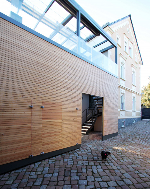 Bild: Thomas Laubert Regenerative Energien, zeitgemäße Architektur, natürliche Materialien, Stahl, Holz und Glas, Arbeit und Privates vereint. Der bestehende Verbinderbau ist nun Heizzentrale mit autarken Konzept, ein Ort mit Oben und Unten, ein Ort, der vieles kann: ankommen, empfangen, präsentieren – bewusst und sichtbar; ein veränderbarer Raum mit allen technischen Raffinessen. Schon fast wie nebenbei verschmilzt er den gründerzeitlichen Bestand mit dessen geplanter Umgebung und hält für Interessierte einen verdutzten Augenblick bereit.
