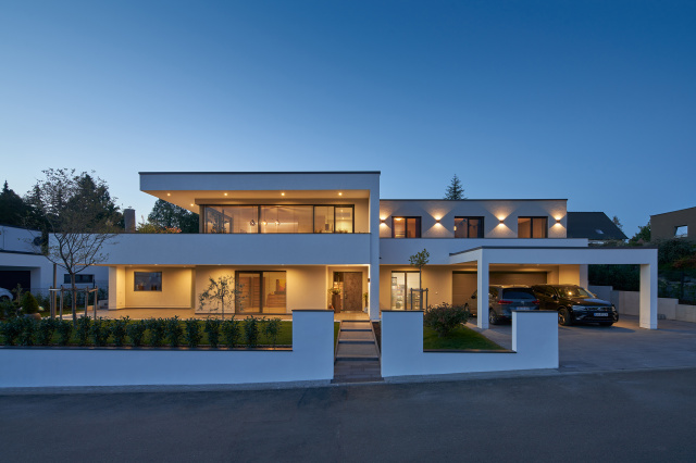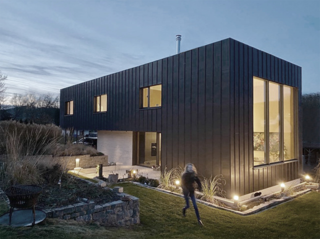 Südostansicht, Bild: Christian Brüstel Im ländlichen Raum bildet dieser Anbau einen bewussten Kontrast zum konventionellen Bestandsgebäude der 1950er-Jahre als eine zeitgemäße hochwertige Erweiterung. Der Baukörper gliedert sich in einen massiven Sockel aus Beton/Klinkerstein und einen „aufgelegten Bügel“ aus einer Holzrahmenkonstruktion/Stehfalzfassade, welche formal das Carport sowie den südlichen Terrassengang überkragt. Angebunden wurde der Neubau über eine Fuge an den Bestand, in dem sich, gut mit Tageslicht versorgt, die neue Erschließung befindet. Den Bauherren war es wichtig, den Bestand (und damit verbundene Erinnerungen) modernisiert zu erhalten und diesen mit einer eigenständigen Kubatur aus nachhaltigen Baustoffen für den zusätzlich benötigten Wohnraum zu ergänzen.