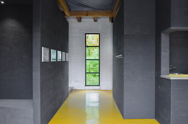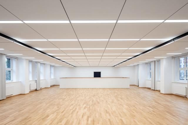 Co-Working-Space, Bild: Tino Sieland Gewachsene traditionelle Bürostrukturen treffen auf neue, flexible Arbeitswelten. Lebendiger, roher Beton und schlichte Flächen treffen auf farbliche Akzente, Holz und schwarzen Stahl. Skulpturale Aus- und Einbauten ergänzen bestehende Raumvolumen, ausgewählte Beleuchtungskonzepte die lichtdurchfluteten Glasfassaden. Das mehr als zwanzig Jahre alte Verwaltungsgebäude wurde in Teilbereichen des Erdgeschosses auch baulich den heutigen Anforderungen angepasst. Durch Eingriffe im Roh- und Ausbau wurde die vorgefundene Raumsituation weiter ausformuliert und mit einem eigenständigen Farb- und Materialkonzept in ein, in seiner Form einzigartiges, „Denk-Deck“ mit Forum überführt. Entstanden ist ein Co-Working-Space, der zum kreativen Arbeiten einlädt.