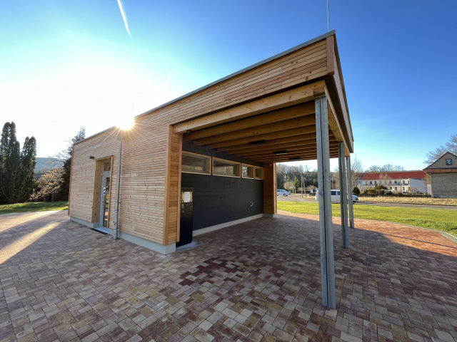 Eingangsseite, Bild: Ulrike Eichberg Für den Jenaer Ruder- und Seesportverein e.V. hat die Kommunale Immobilien Jena (KIJ) ein neues Ruderbootshaus in Auftrag gegeben. Das Gebäude wurde auf einem massiven Sockel in Holzbauweise errichtet. Im Erdgeschoss befinden sich die Bootslagerhalle, die Reparaturwerkstatt sowie die Haustechnikräume. Ebenso wurde hier eine barrierefreie Sanitäreinheit untergebracht, die künftig auch Wasserwanderern zur Verfügung stehen soll. Im Obergeschoss sind die Vereinsräume angeordnet, ebenso die Umkleiden und Sanitärbereiche für die Sportlerinnen und Sportler. Das weit auskragende Dach schützt große Teile der großzügigen Terrassen, die so wetterunabhängig eine vielfältige Nutzung in den Sommermonaten ermöglichen.