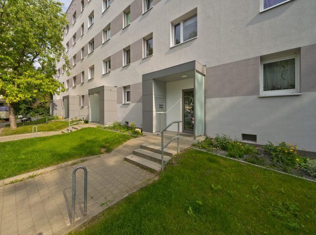 Straßenansicht, Bild: Thomas Laubert Sensibler Eingriff – großer Nutzen. Gewollt unverändert präsentiert sich das äußere Erscheinungsbild nach der Sanierung und fügt sich damit in das Gesamtensemble aus insgesamt sieben Mehrfamilienhäusern ein. Die in den 1920er-Jahren errichtete und unter Denkmalschutz stehende Anlage weist einheitliche Gestaltungsmerkmale auf, welche bei der Umsetzung beachtet und abgestimmt wurden. So präsentiert sich der notwendige Balkonersatzneubau in Stahlbauweise als moderne Interpretation und nimmt die historische Formensprache auf. Geringe Eingriffe mit gezielter Grundrisskorrektur schufen zeitgemäßen Wohnraum. Technisch, energetisch ertüchtigt und ressourcenschonend ausgeführt zeigen die Objekte eine gelungene Sanierung im Bestand.