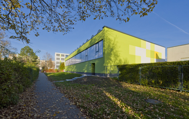 Spielplatzansicht, Bild: Matthias Funken Der Neubau wurde komplett in Massivholzbauweise elementiert erstellt. Die sichtbaren Holzflächen der Wände und Decken geben den Räumen eine besondere Behaglichkeit. Konzipiert und umgesetzt wurden zwei erdgeschossige Kleinkindgruppen, drei Gruppen für Kinder ab vier Jahren, ein Kinderrestaurant, diverse Kreativräume sowie die Garderobenanlagen. Die Gesamtkapazität ist auf 90 Kinder ausgelegt. Erkerfenster erlauben individuelle Ausblicke und dienen auch als Rückzugsorte. Der zentral im Erdgeschoss befindliche Multifunktionsraum orientiert sich mit seiner gebogenen Fassade zum mittelalterlichen Kirchturm der Bonifatiuskirche. Das zwischen Neubau und Kirche liegende Außengelände umfasst eine Rollbahn in Form einer Acht, die auch als barrierefreie Rampe genutzt wird.