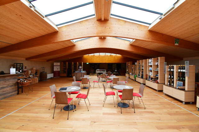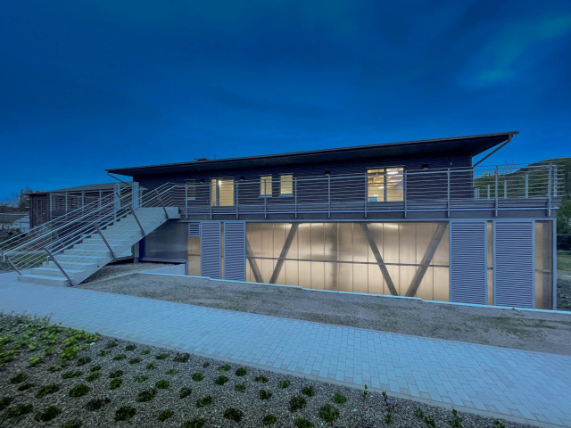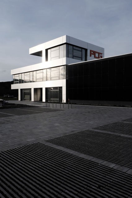 Fassadendetail, Bild: Tino Sieland Die Produktion technischer Gläser prägt seit Jahrzehnten das Ortsleben in Remda-Teichel. Der errichtete Holzbau in Form einer Aufstockung wird für Jahrzehnte das Ortsbild prägen. Er steht als Auftakt für die Investition in den ländlichen Raum Thüringens. Eigenständig und stark ablesbar scheint die hinterleuchtete Industrieglasfassade in die Nacht; am Tag schaffen die Außenterrassen eine Gliederung der Innenräume, stellen den landschaftlichen Bezug her und lassen Ein- und Ausblicke zu. Im Inneren schaffen Akzente in Holz und eine Farb- und Formensprache in Anlehnung an den Unternehmensauftritt ebenfalls Bezüge zu den dort produzierten technischen Gläsern. Nicht zuletzt schlägt die Ausstellungswand zur Firmenhistorie den Bogen aus der Vergangenheit in die Zukunft.