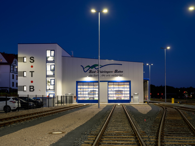 Nordansicht, Bild: Matthias Frank Schmidt Auf einer Brachfläche des ehemaligen Güterbahnhofes in Meiningen wurde ein Service-Center für die Fahrzeugwartung der Süd-Thüringen-Bahn GmbH neu errichtet. Dazu gehören neben einem Büro- und Sozialgebäude die Werkstatt mit vier Arbeitsständen, Arbeitsgruben- und Abgasabsauganlage, ein Teilelager, eine Waschgrube, eine Tankstelle für 100.000 Liter Diesel, Ver- und Entsorgungsstationen für Wasser und Abwasser der Fahrzeuge, ein Freikran zur Entladung von Liefer-LKW, Öllager für die benötigten Betriebsstoffe sowie die Freianlagen mit Parkplatz und Dieselbetankungsfläche. Zum Planungsauftrag gehörten neben der Gebäudeplanung auch die Projektsteuerung und die Planung von technischen Anlagen wie Ölversorgungstechnik, Tankstelle, Entsorgungsstationen und Abgasabsaugung.
