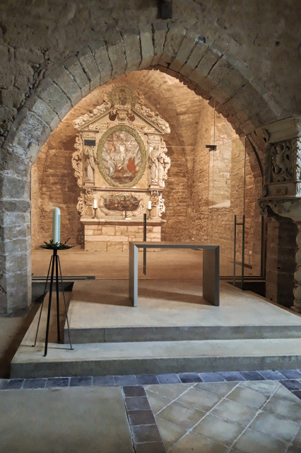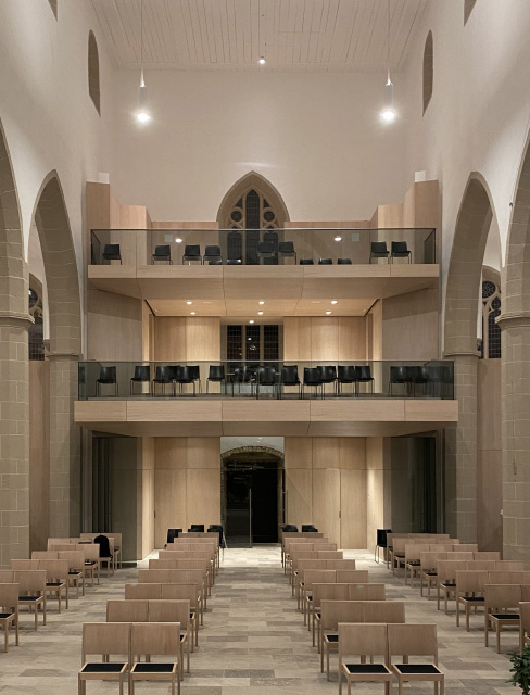 Blick zum Westeingang und zu den Emporen, Bild: Peter Tandler Die langjährige Auseinandersetzung mit der Geschichte, dem Denkmal und der wertvollen künstlerischen Ausstattung der Kirche sowie den Bedürfnissen und Wünschen der Gemeinde war Grundlage für den Umbau des Kirchenraumes. Die neuen, im Grundriss und in der Vertikalen gestaffelten, begehbaren Raummöbel wurden bewusst nur im westlichen Teil der Kirche angeordnet, um die lichtdurchflutete Raumqualität der ehemaligen gotischen Basilika wieder erlebbar werden zu lassen. Die klare räumliche Differenzierung zwischen Alt und Neu – durch den respektvollen Abstand der neuen Elemente zum historischen Bestand – lässt neue spannende Licht- und Raumfugen entstehen. Die neuen Oberflächen thematisieren die vorhandene Materialität und Farbigkeit der gotischen Architektur und führen zu einem neuen Ganzen.