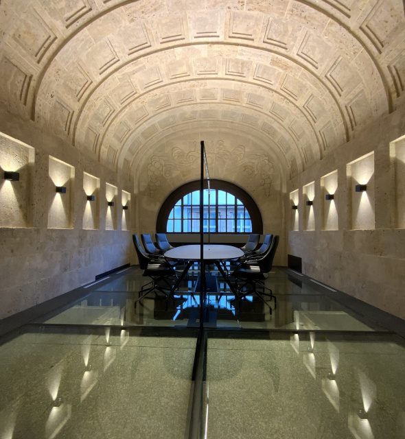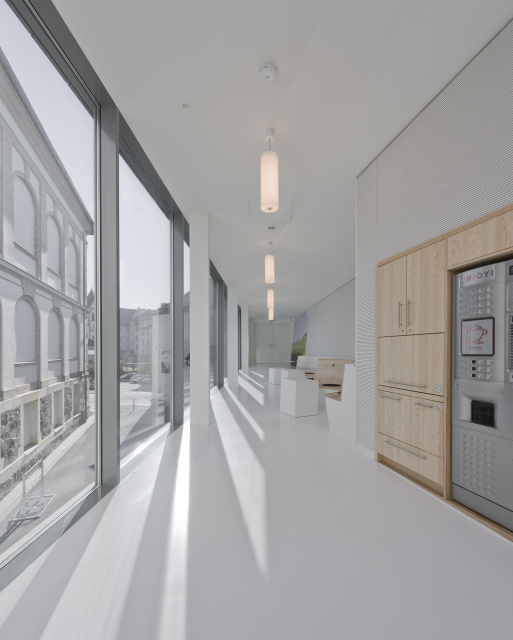 Meetingraum, Bild: Gisbert Bachrodt Die Sparkasse beabsichtigte, die ehemalige Kassenhalle im neuen Kontext als Beratungszone wiederzubeleben. Entwurfsziel war es, zehn attraktive und zeitgemäße Beratungsplätze, einen Vorbereitungsraum und einen Meetingbereich zu schaffen. Darüber hinaus war der Wunsch nach einer Empfangszone und einer Möglichkeit zur Nutzung für Veranstaltungen in kleinem Rahmen entwurfsbestimmend. Die Qualitäten des Hauptraumes waren offensichtlich und so fiel die Entscheidung, diesen Raum zu adaptieren und ihn in einen Meetingraum zu verwandeln. Durch seinen Glasboden kann heute noch der historische Eingangsbereich nachvollzogen werden, der durch die neu etablierte Zugangssituation über das City-Carrée obsolet wurde. Im Bereich der ehemaligen Vorhalle wurde ein öffentlicher Bereich geschaffen.