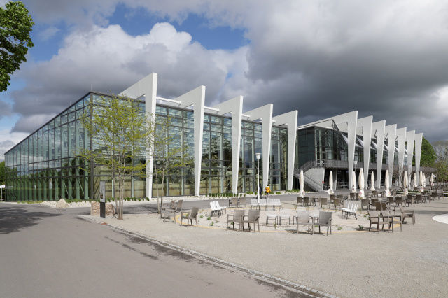 Danakil-Klimazonenwelt im egapark, Bild: Oliver Kern Im Zentrum der ega, am Standort der ehemaligen Zentralgaststätte, entstand eine „ferne Welt“, in der gegensätzliche Klimazonen auf mehreren Ebenen erlebbar werden. Das Projekt orientiert sich dabei klar an den ursprünglichen Grundgedanken des Landschaftsarchitekten Reinhold Lingner aus den 1960er-Jahren. Am Kristallisationspunkt des Parks werden die vorhandenen Elemente wie Hauptwegeachse mit „großem Blumenbeet“, Wasserachse und Ringterrassen aufgenommen und über die neuen Bauwerke Wüsten-/Urwaldhaus, Wintergarten und Rendezvousbrücke räumlich ergänzt. Die zwei neuen Hallenbaukörper und die neue Rendezvousbrücke gliedern sich städtebaulich in die vorgegebenen Baufelder und orientieren sich an der ursprünglichen und denkmalgeschützten Parkstruktur.
