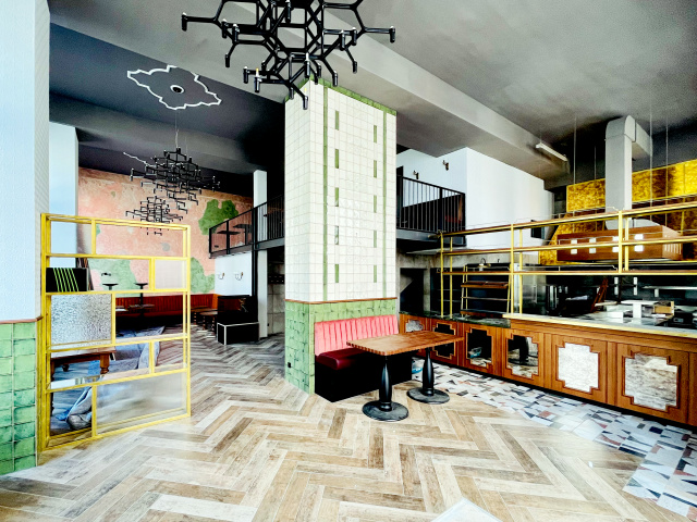 Gastraum und Küche, Bild: Christian Brüstel In zentraler Lage am Universitätshauptgebäude etabliert Fritz Mitte den vierten Standort in Thüringen. Das neue Lokal in der einstigen Schalterhalle für Auslandsdevisen der Staatsbank erinnert an eine lebendige Hotellobby, in der kulinarische Wünsche beinahe rund um die Uhr bedient werden. Im eklektischen Stil soll eine neue Location mit Wohnzimmeratmosphäre entstehen, in welcher sich aufgeschlossene Menschen zu Comfort Food und besten Drinks treffen. Die neue Stahlgalerie zeigt ihre Konstruktion offen im modernen Stil und staffelt den loftartigen Gastraum in die Tiefe. Eine komplexe Raumlüftung ermöglicht geruchsarm das Konzept der offenen Küche und klimatisiert den Gastraum zum allzeit angenehmen Ort.