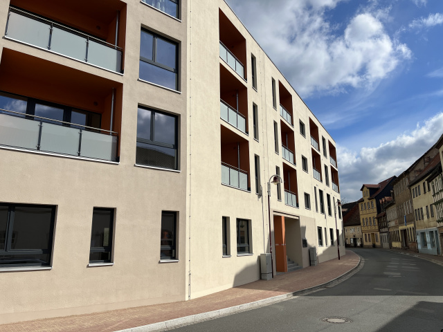 Herrenstraße, Bild: Thomas Grimm Mit dem neuen Quartier am Markt in Stadtroda wurde eine langjährige innerstädtische Brachfläche reaktiviert und eine städtebauliche Lücke im Stadtbild geschlossen. Das aus drei Neubauten bestehende Ensemble schließt alte bauliche Kanten und schafft gleichzeitig neue urbane Räume mitten in der Stadt. Die Gebäude, die hauptsächlich dem barrierefreien Wohnen von pflege- und betreuungsbedürftigen Menschen dienen, beherbergen 30 Wohnungen, eine Tagespflege, eine ambulant betreute Wohngemeinschaft sowie Dienst- und Verwaltungsräume des DRK und weitere Gewerbeflächen. Die öffentliche Plaza im Inneren, die dorthin ausgerichteten Laubengänge und die Durchlässigkeit des Quartiers schaffen Raum für Begegnung und Teilhabe zwischen Bewohnerinnen und Bewohnern sowie der Öffentlichkeit Stadtrodas.