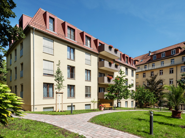 Neubau Südansicht, Bild: Thomas Müller Für das unter Denkmalschutz stehende historische Pflegeheim an der Arnstädter Straße bedurfte es Mitte der 2010er Jahre einer erneuten Beschäftigung mit dem baulichen Zustand und den inneren Strukturen. Insbesondere der Mangel an eigenen Bädern für die Bewohnerinnen und Bewohner, fehlende moderne Wohngruppenstrukturen und die notwendige Anpassung der Haustechnik an gestiegene technische Anforderungen machten eine Sanierung und Umstrukturierung des Hauses erforderlich. Mit der Idee „Aus drei Zimmern mach zwei mit Bad“ verbesserte sich der Standard im Bestand erheblich, erforderte jedoch eine Kompensation der wegfallenden Zimmer. Mit dem Erweiterungsneubau konnten die Kapazität des Hauses von insgesamt 168 Pflegeplätzen gehalten und neue Strukturen in der Pflege – für das ganze Haus – ermöglicht werden.