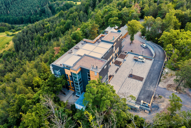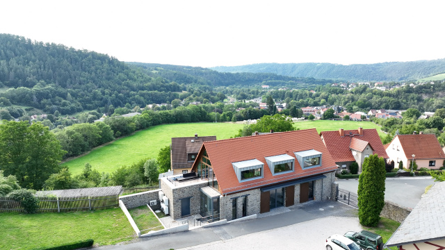 Luftbild Kulmberghaus, Bild: Daniel Suppe Das Kulmberghaus befindet sich auf einer der höchsten Erhebungen des Saaletales im Landschaftsschutzgebiet Kulm. Es wurde 1969 auf dem Standort einer ehemaligen Schutzhütte errichtet. Zahlreiche Wanderwege führen zum Kulmberghaus und dem angrenzenden Kulmbergturm. Das Objekt wurde umgestaltet, ohne den prägenden Charakter wesentlich zu verändern. Nördlich an das Hauptgebäude grenzend wurde ein zusätzliches Untergeschoss mit Tiefgarage und den Haustechnikbereichen ergänzt. Das teilbegrünte Parkdeck der Tiefgarage dient als Haupteingang zum Hotel und zum Restaurantbereich. In den beiden Obergeschossen des Kulmberghauses sind die Appartements eingegliedert. Das Restaurant mit Außenterrasse und Panoramablick auf das Saaletal befindet sich im Souterrain.