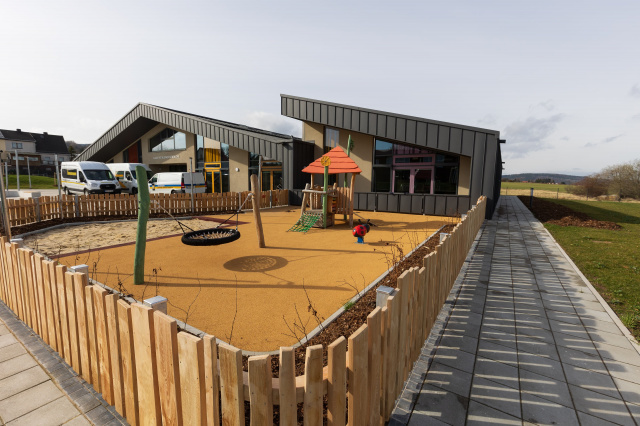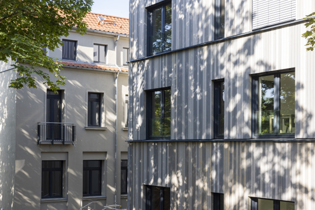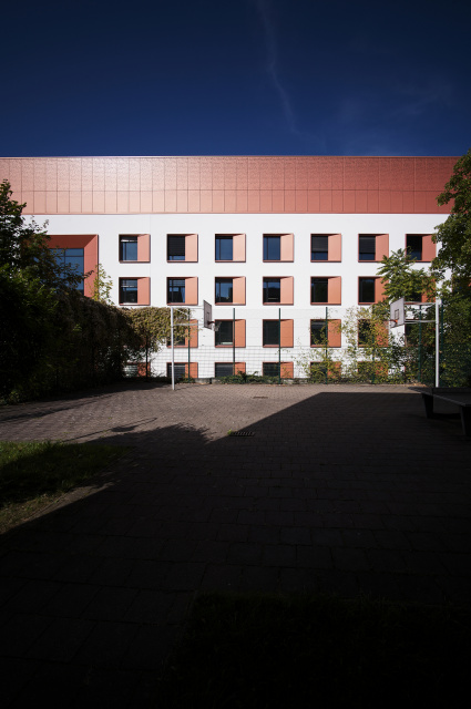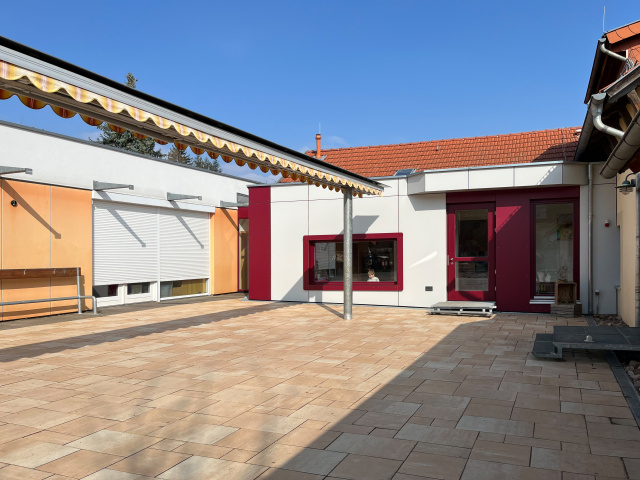 Hof, Bild: Matthias Funken Bei dieser Maßnahme sollten sowohl räumliche Problematiken, wie Enge, mangelhafte Belichtung und Belüftung, als auch technische Missstände, wie Stolperfallen an den Treppenstufen, ausgeleierte Bauteile usw., behoben werden, um den Sanierungsstau der vergangenen 20 Jahre in den betreffenden Bereichen aufzuheben. Der erste Bauabschnitt umfasste die Entkernung und Sanierung des Untergeschosses, der zweite die Entkernung des Verbindungsbaukörpers zwischen Altbau und hofseitigem Anbau aus 2006. Es wurde ein neuer Verbindergang in nachhaltiger Holzbauweise vorgebaut. Im Sanierungs- und Ausbaubereich wurden ein neues Kinderbad, eine Garderobe sowie weitere Nebenräume geschaffen.
