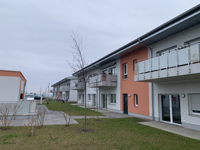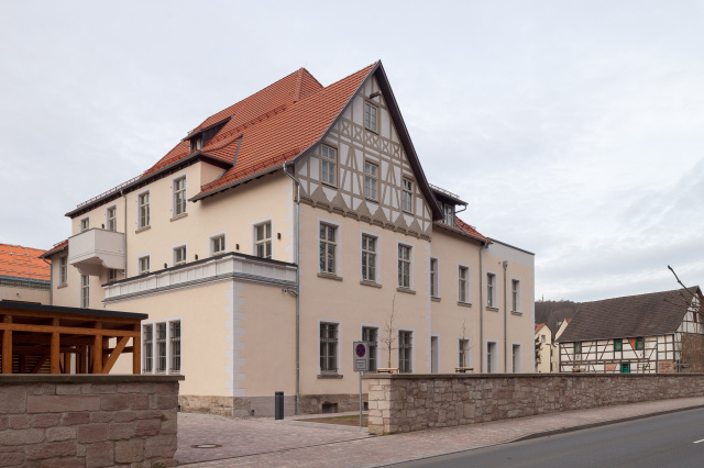 Bestandsgebäude und Neubau, Bild: Christoph Beer Die ehemalige Landwirtschaftsschule aus dem Jahr 1889 wurde durch die AWG Wohnungsgenossenschaft eG Altenburg umgebaut und erweitert. Es entstand ein neues Zuhause für Menschen mit Behinderung, in dem die Bewohnerinnen und Bewohner selbstbestimmt ihren Alltag gestalten können. Ein Verbindungsbau mit zentralem Eingang verknüpft das behutsam sanierte Bestandsgebäude mit dem modernen dreigeschossigen Neubau. Die Pflegeeinrichtung mit Appartements und offenen Gemeinschaftsbereichen befindet sich im Neubau. Verwaltung, Personalräume sowie barrierearme Wohnungen sind im Altbau untergebracht. Der Neubau wurde mit einer vorgesetzten Holzfassade verkleidet. Die unterschiedlichen Grade der Vorvergrauung geben dem Haus einen warmen, lebendigen Charakter. Ein großzügiger Garten umschließt das Gebäude.