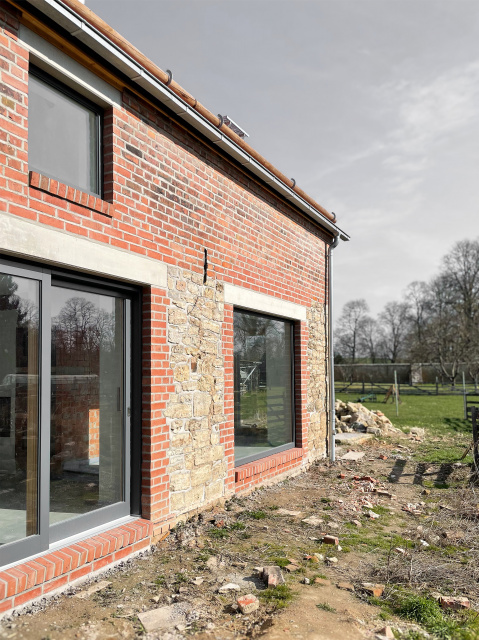 Blick in Richtung Schlosspark, Bild: Lina Maria Mentrup Bei der Bauaufgabe handelt es sich um die Umnutzung eines ehemaligen Kuhstalls zum Wohnhaus. Als Teil eines baulichen Ensembles befindet sich das Gebäude zurückgesetzt zur Dorfstraße in unmittelbarer Nähe zum Schlosspark Kromsdorf. Für die neue Nutzung konnten die historische Struktur des Gebäudes sowie das gesamte Tragwerk erhalten bleiben. Im Erdgeschoss dominieren Natursteine, Ziegel und Stahlträger, die die Raumstruktur stützen. Im Obergeschoss befindet sich ein klassisches Holztragwerk. Ein offener Wohn- und Essbereich prägt das Erdgeschoss. Galerien und Lufträume bilden die Verbindung zum Obergeschoss mit den Schlafräumen. Die bestehenden Materialien wurden behutsam aufgenommen, konstruktive Fehlstellen mit neuen Materialien sichtbar ergänzt.