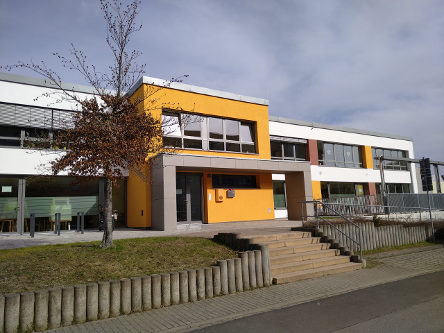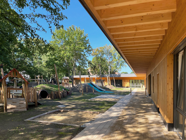 Ansicht, Bild: Susanne Kaulbars Um wachsenden Schülerzahlen und dem gestiegenen Raumbedarf nachzukommen, wurde die Schule um einen Anbau erweitert. Die Nordfassade öffnet sich großzügig zum Gewässer und bietet einen qualitätsvollen überdachten Aufenthalt im Freien. Der Flur dient neben der Erschließung durch Aufweitungen und Einbauten gleichzeitig als Bewegungs- und Garderobenfläche. Ein Gemeinschaftsraum lässt sich mittels Schiebefaltwand in zwei kleinere Einheiten teilen. Das Bauwerk fußt wegen des schwierigen Baugrunds in Hochwasserlage auf einer Stahlbetonkonstruktion. Konstruktionsvollholz bildet das Dachtragwerk und leistet durch den regionalen Produktionsstandort neben der Holzständerbauweise, holzsichtig belassenen Oberflächen im Innenbereich sowie der Lärchenfassade einen wichtigen Beitrag zur Nachhaltigkeit.