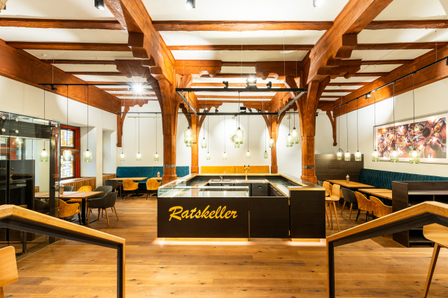 Ratskeller, Bild: Axel Bauer (formplus) Einfach umbauen: Dass sich das Bestehende nur durch transformierende Eingriffe dauerhaft erhalten lässt, gilt im Besonderen für die Architektur. Am Beispiel des Ratskellers in Schmalkalden zeigt sich eindrucksvoll, dass mutige und unkonventionelle Umbauten unter Berücksichtigung des denkmalgeschützten Bestandes – in diesem Fall aus dem Jahr 1419 – zu einem harmonischen Ergebnis führen können. Dabei wurde die historische Tragstruktur des großen Kellers raumbildend herausgearbeitet. Im Zentrum des Raumes wurde ein Multifunktionstresen eingeordnet, der die neuen Einbauten in schlichter und zeitgemäßer Formensprache um sich herum gruppiert. Die Ausstattung ist sehr flexibel: Ob Restaurant, Bistro, Bar, Café, Lounge oder Konferenz – der Ratskeller bietet nach dem Umbau alle Nutzungen an.