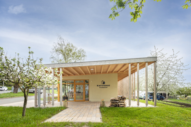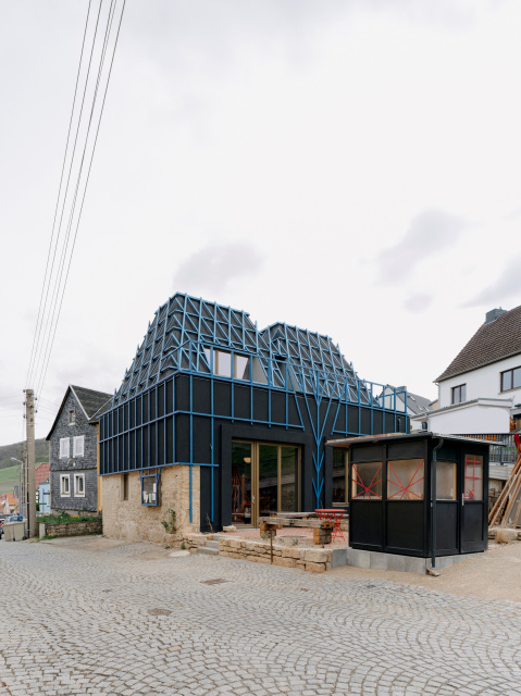 Vogelperspektive, Bild: Max Buchholz Auf der Basis der ursprünglichen Bebauung wurde das kleine Scheunengebäude wieder errichtet. Historische Gestaltungselemente sollten in zeitgemäße Materialien und Details „übersetzt“ werden. Die klare Struktur der ursprünglichen Scheune wurde durch die Bruchsteinfassade, umlaufend als Sockelgeschoss, wieder aufgenommen. Das Dachgeschoss zeigt sich in „optischem Fachwerk“ mit verglasten Gefachen, um durch ausreichende Belichtung der heutigen Nutzung Rechnung zu tragen. Durch die beidseitige Öffnung des Neubaus treten die Nutzerinnen und Nutzer mit der Region und dem Schlossgebäude in Beziehung. Im Erdgeschoss befinden sich die Wildfleischerei mit Zerwirkung und Wurstproduktion sowie ein kleiner Hofladen. Im Dachgeschoss wurde die Jagdschule eingerichtet, wobei der Schulungsraum auch für Trauungen genutzt wird.