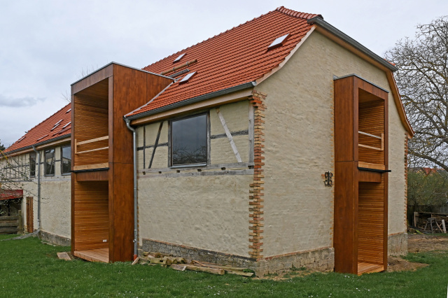 Ferienhaus „Feuer und Flamme“, Bild: Stefan Adlich Das ehemalige Gebäude der Ortsfeuerwehr verwandelt sich zu einem Haus für besondere Erlebnisse. Die Lage mitten im Ortskern von Kunitz, in fußläufiger Entfernung zur Stadt macht dieses Haus zu einem Objekt mit öffentlicher Wahrnehmung. Das Gebäude wurde grundlegend umgebaut und mit seiner neuen skulpturalen Form zum Vorplatz hin ausgerichtet. Im großzügigen Innenraum trifft man sich, kocht und tafelt gemeinsam. Wer möchte, übernachtet auf einer Schlafempore. Der Innenraum wird von zwei Oberlichtern geprägt. Oder handelt es sich um zwei Kaminabzüge? Das Bestandsmauerwerk im Erdgeschoss wurde in Massivbauweise ergänzt. Das neue Dachgeschoss ist als Zimmermannskonstruktion auf den Baukörper aufgesetzt. Der Innenraum inszeniert die architektonische Gebäudeform.